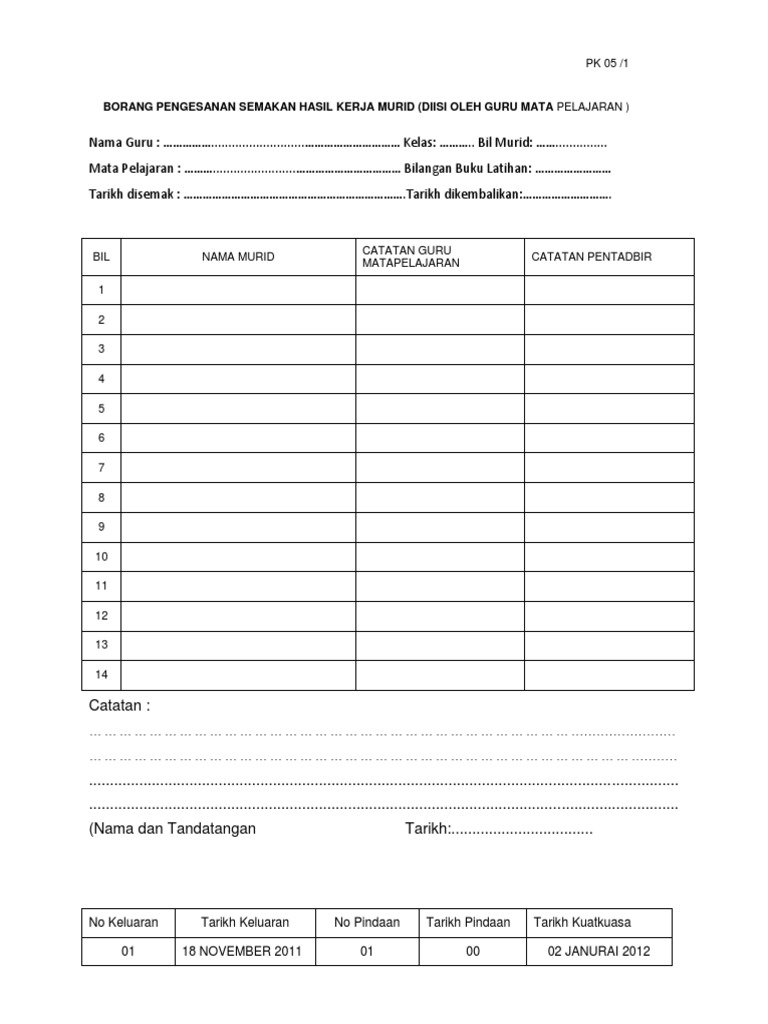 Borang Semakan Buku Kerja Murid