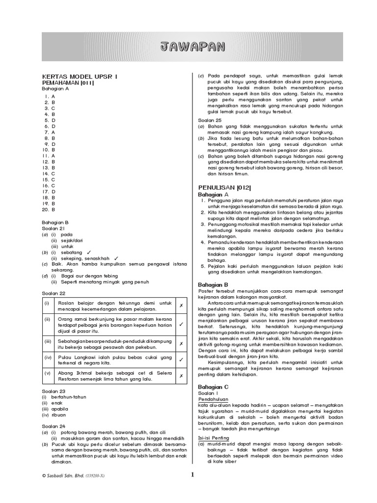 Jawapan Kertas Model Upsr Modul Aktiviti Pintar Cerdas Bahasa Melayu Tahun 6