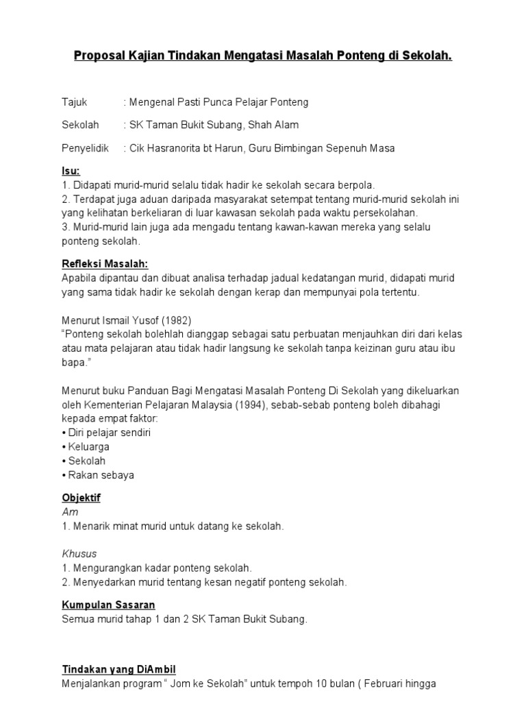 Proposal Kajian Tindakan Mengatasi Masalah Ponteng Di Sekolah