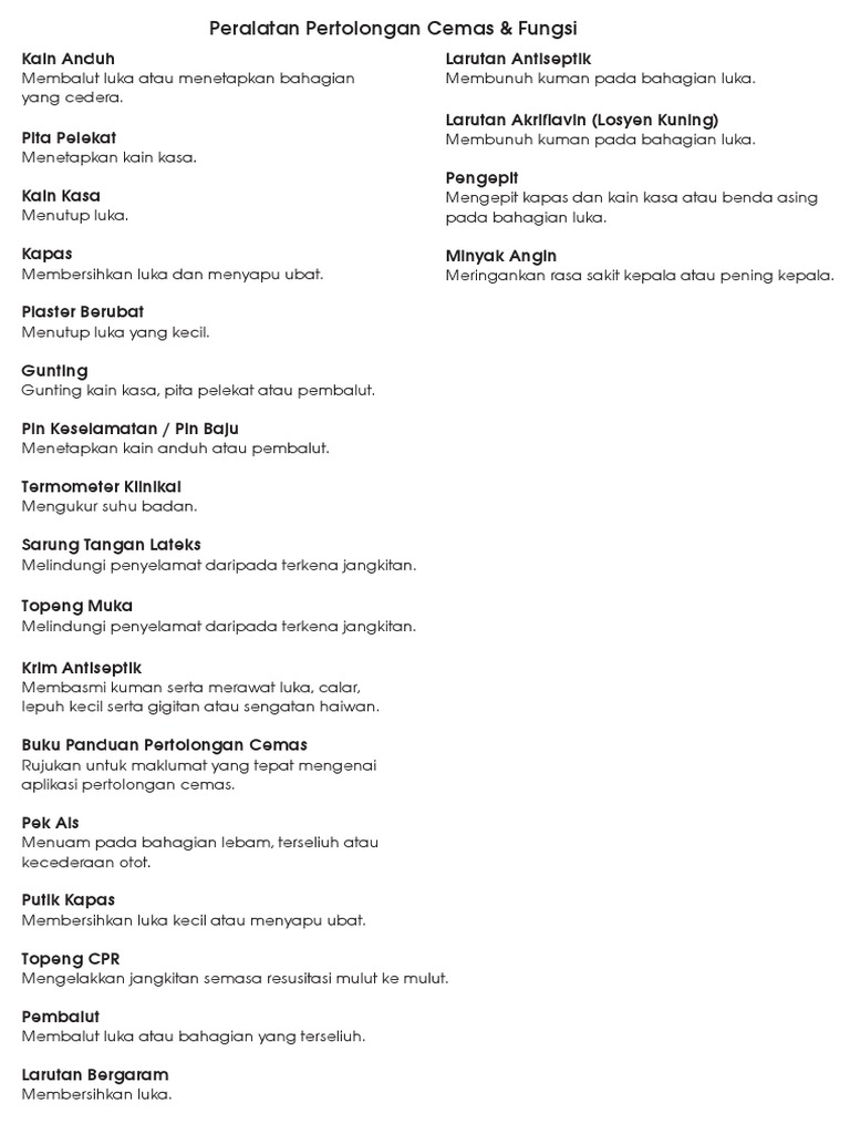 Bahan Fungsi Peti Pertolongan Cemas