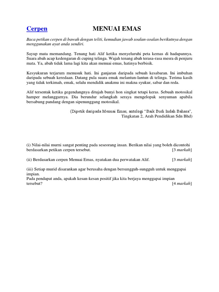 Cerpen Menuai Emas Soalan Dan Jawapan
