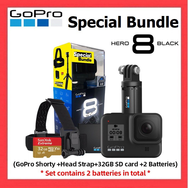 Gopro Hero8 Bundle Get The New Hero8 Black Shorty Grip Head Strap A 32gb Sd Card And Spare Battery