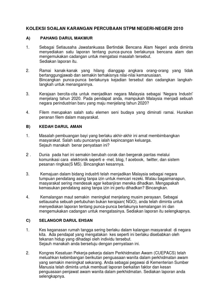 Koleksi Soalan Karangan Percubaan Stpm Mengikut Negeri 2010