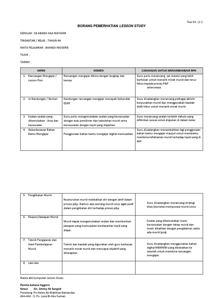 Rumusan Borang Lesson Study Kitaran 1 Bi Docx