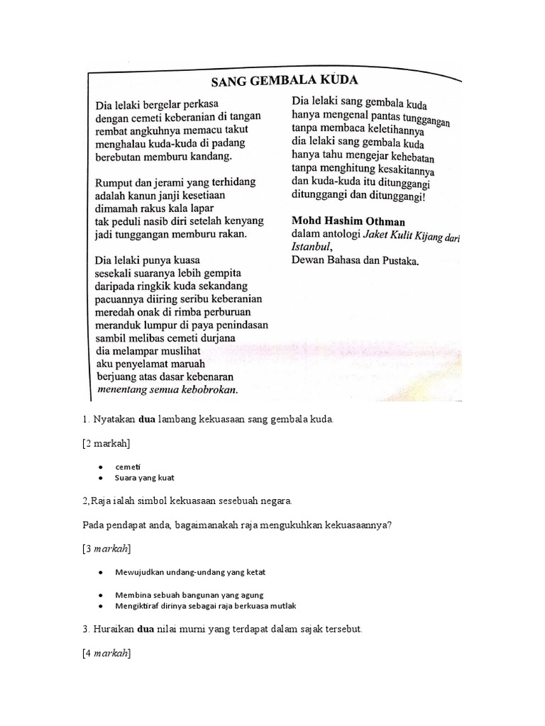 Sajak Sang Gembala Kuda Soalan Dan Jawapan