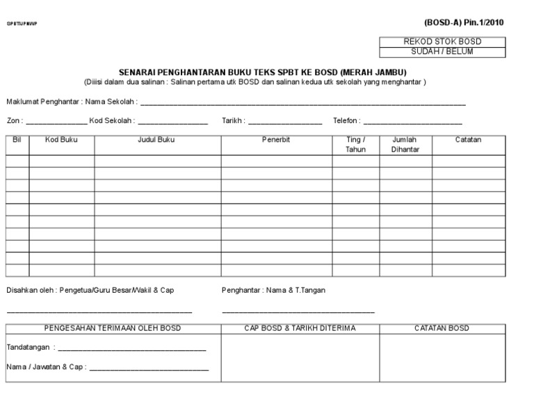 Borang Penghantaran Buku Bosd A Pin 1 2010