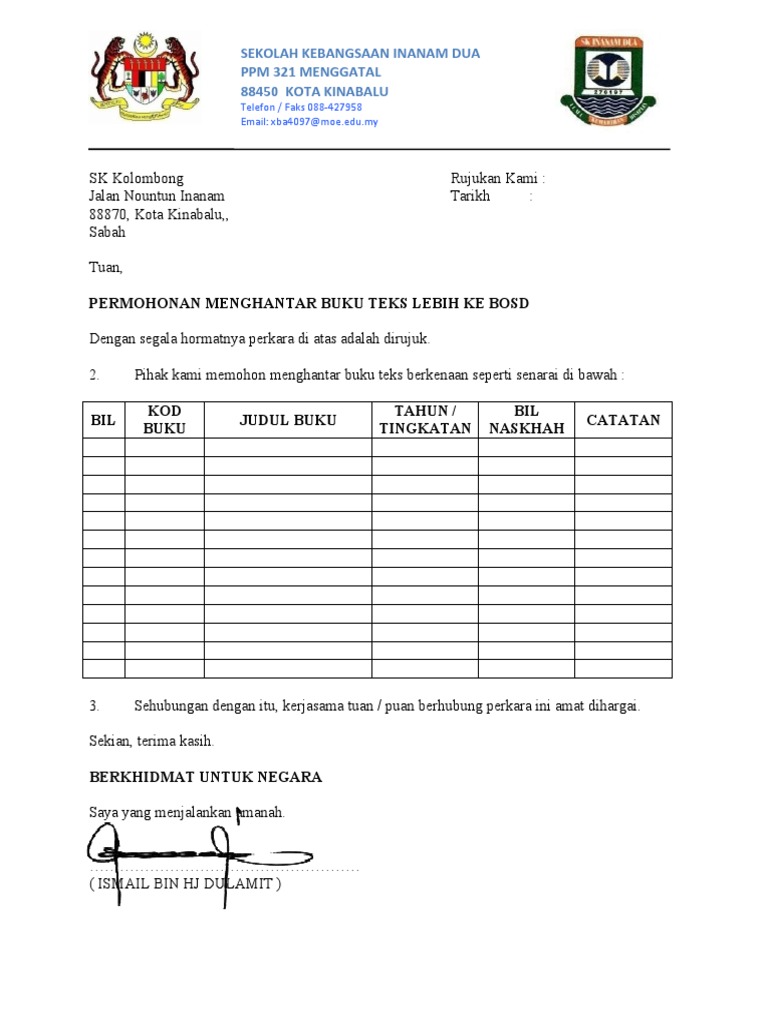 Surat Hantar Buku Teks Contoh Kota Kinabalu