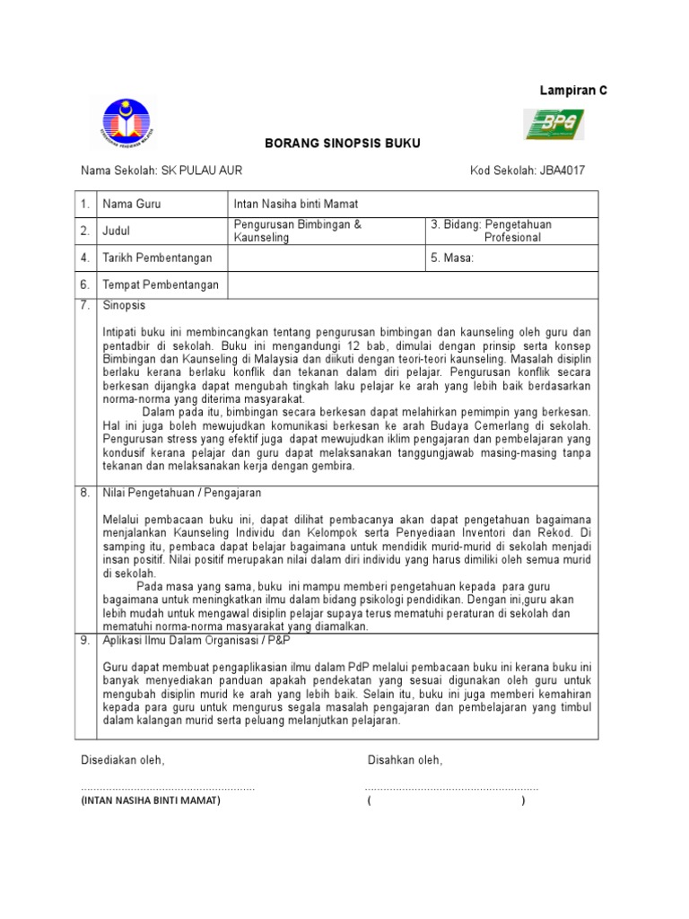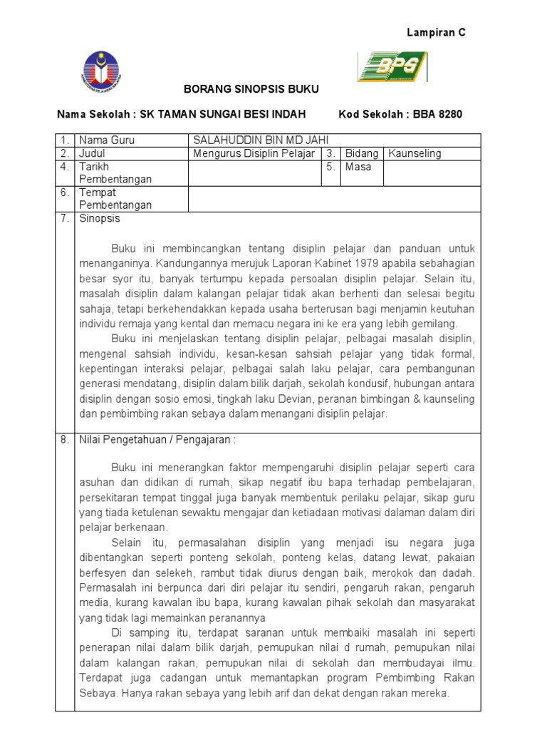 Borang Sinopsis Buku Mengurus Disiplin Pelajar Abdullah Sani Yahaya 244 Ms Doc
