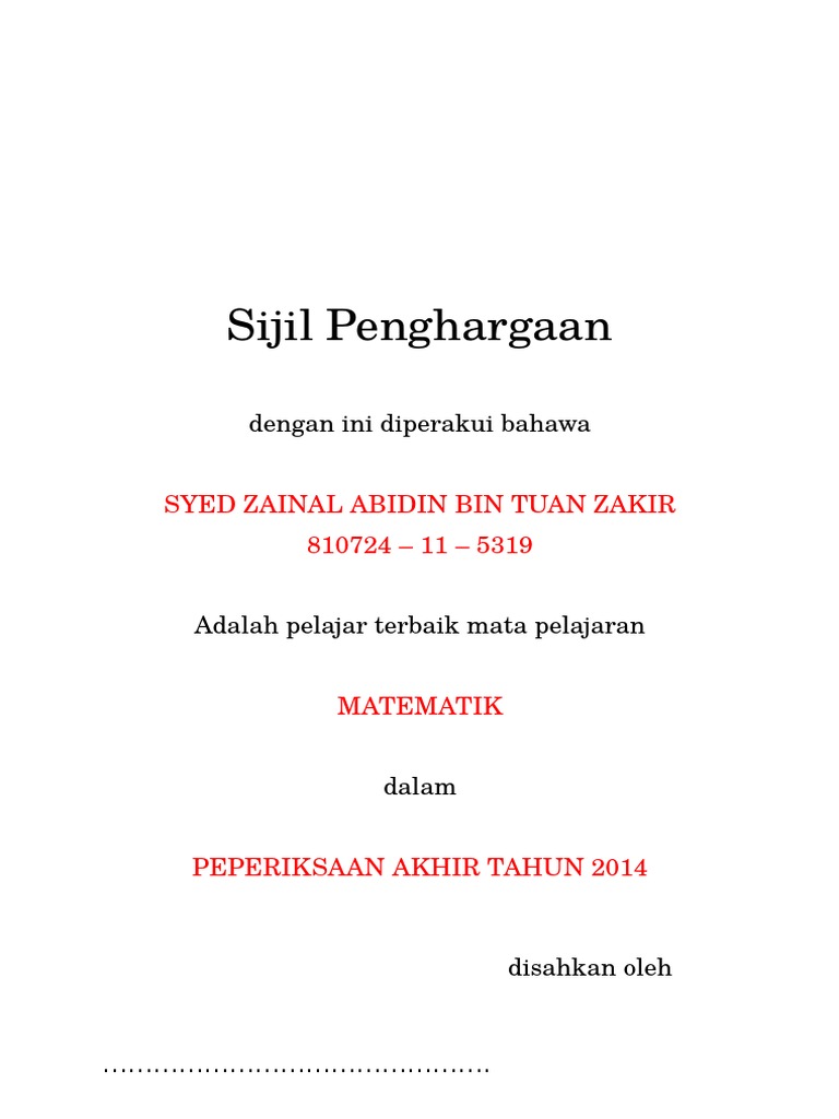 Template Sijil Penghargaan Matapelajaran Terbaik